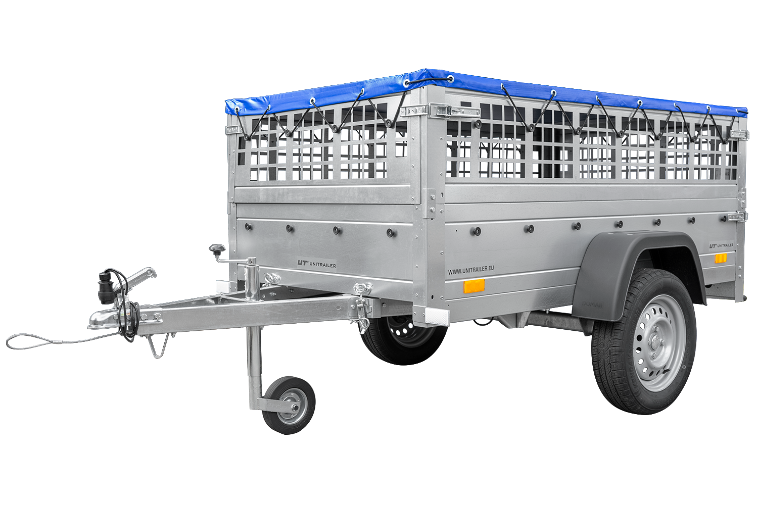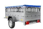 Großer Kippanhänger mit blauer Ladefläche, Gitterwänden und Stützrad, Modell Garden Trailer 200 KIPP. Dank seiner großzügigen Ladefläche von 200 x 106 cm ermöglicht dieser Anhänger den Transport schwerer Lasten oder sperriger Gegenstände, die normalerweise nicht in Ihr Auto passen . Das zulässige Gesamtgewicht (GZG) von 750 kg erlaubt es jedem Fahrer, den Anhänger sicher an der Anhängerkupplung zu befestigen. Die hohe Plane mit Bügeln und Seitenverlängerungen bietet zusätzlichen Schutz für Ihre Ladung. Durch die Verwendung einer modernen AL-KO- oder KNOTT-Lenkachse garantieren wir, dass auch bei leerer Ladefläche kein Schlagloch Probleme bereitet. Mit unserem großen Kippanhänger, Modell Garden Trailer 200 KIPP, transportieren Sie Ihre Güter stets komfortabel und sicher .