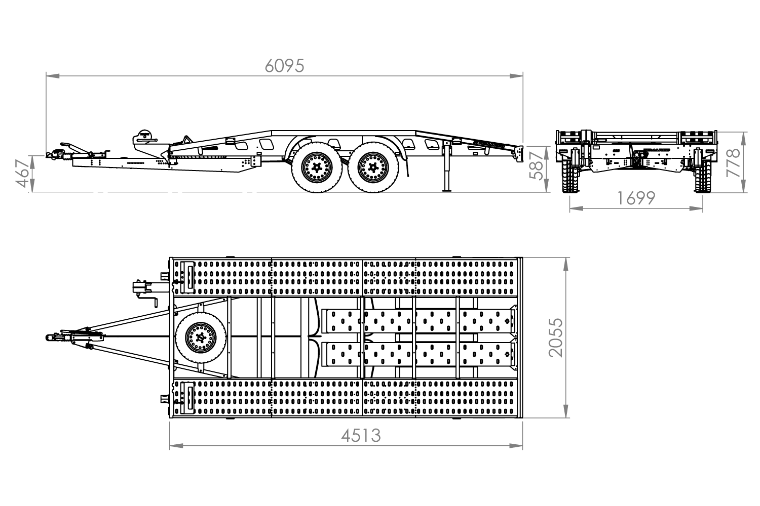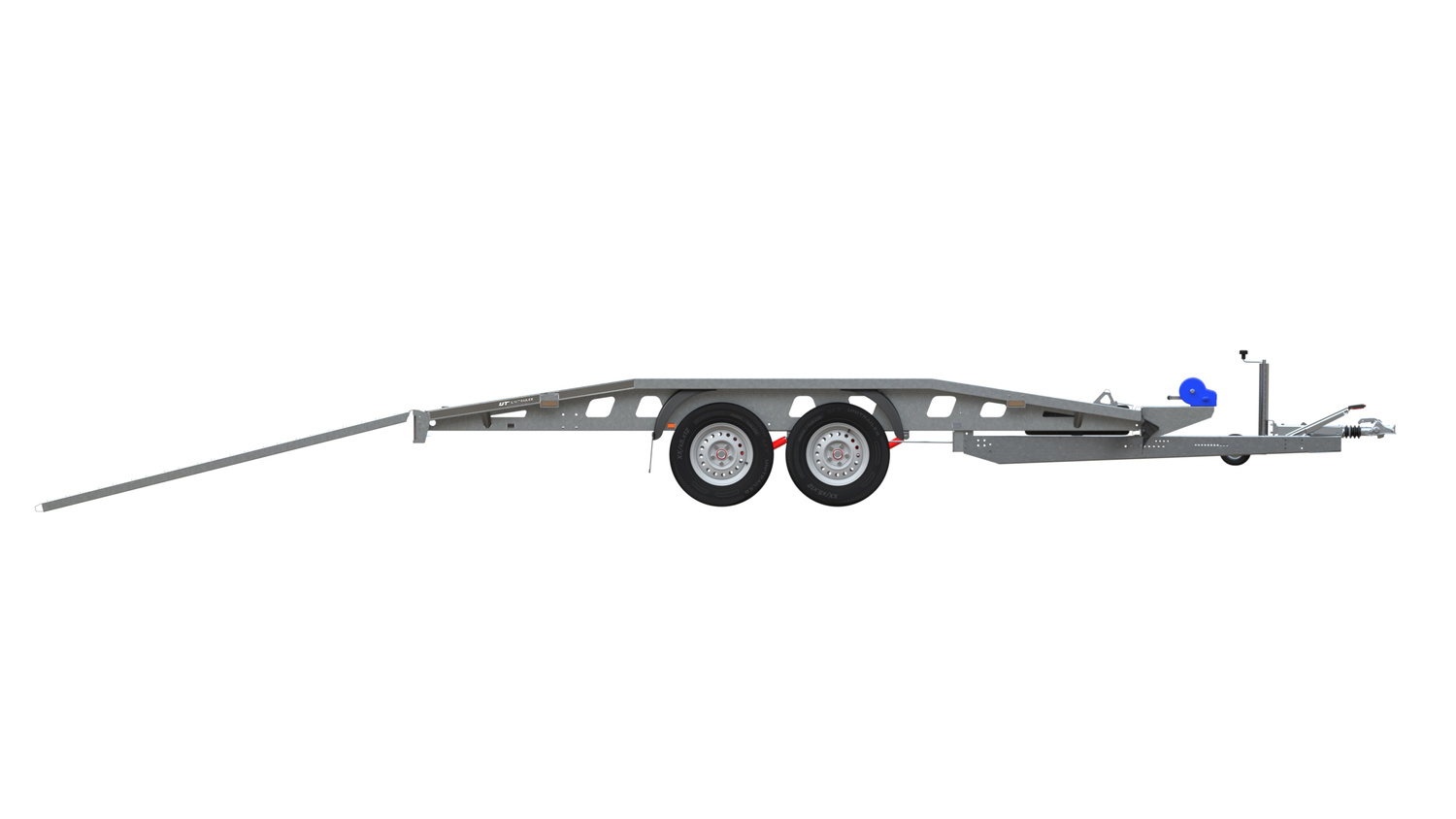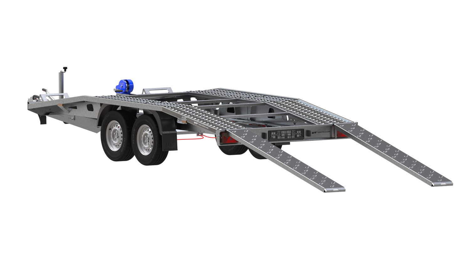 Das Stützrad erleichtert das Aufrichten des Anhängers. Das Zugfahrzeug war außerdem mit einem Reserverad ausgestattet. Die Abmessungen der Schiene betragen 4351 x 2157 mm und das Gewicht von 3000 kg entspricht dem Transport der Fahrzeuge. Stabile Verzurrpunkte sichern die Ladung. Die Stabilität des Anhängers wird durch das verstärkte Stahlchassis gewährleistet.