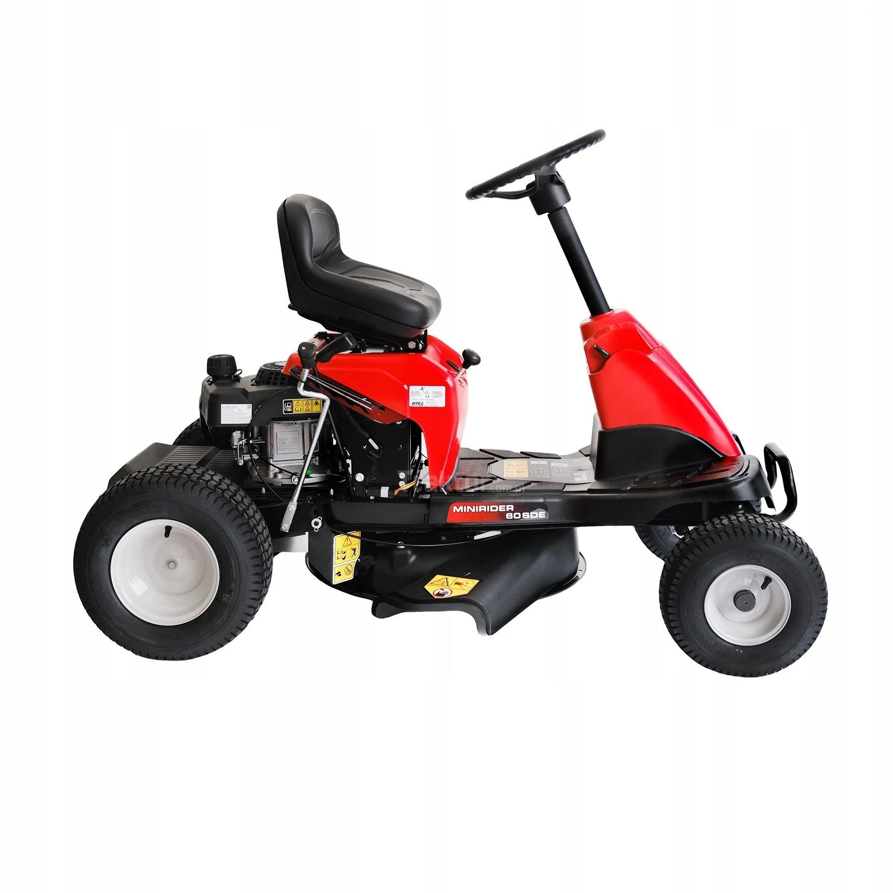 Highlights & Details Schalten ohne zu halten: Transmatic-Getriebe Schnitthöhenverstellung und Mähwerkskupplung Durchsteigerahmen für bequemes Auf und Absteigen Previous Next Beschreibung Die MINIRIDER von MTD sind wahre Alleskönner: Sie können wahlweise das Schnittgut auffangen, auswerfen oder mulchen. Dabei sind sie ideal für kleine bis mittelgroße Gärten, in denen der Einsatz eines Traktors durch Beete, Sträucher oder sonstige Hindernisse eingeschränkt wird. Pfiffig ist vor allem ihr ansprechendes Design und die bequeme Bedienung. Mit diesen Mähern können Sie Ihren Rasen mühelos im Sitzen mähen – dabei stellen auch verwinkelte Gärten kein Problem dar. Durch ihre geringen Ausmaße sind sie wendig und kompakt und können nach dem Gebrauch platzsparend aufbewahrt werden. Alle MINIRIDER können auf engstem Raum untergebracht werden. Aufgrund ihres kompakten Designs brauchen sie kaum mehr Platz als ein vergleichbarer Handrasenmäher. An den Heckauswurfmodellen kann der Fangkorb leicht abgenommen und zur platzsparenden Lagerung auf dem Sitz abgelegt werden. Ausstattung Schnell und einfach Kraftstoff tanken 46 cm kleiner Wenderadius für höchste Flexibilität Luftbereifung Elektro-Starter Komfortable Bedienung 6 Gänge gefederter Fahrersitz Seitendeflektor inklusive. Lieferumfang Rasentraktor · Seitendeflektor · Bedienungsanleitung.