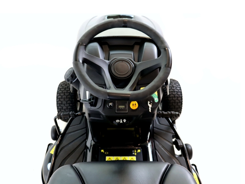 Einfaches Auf- und Absteigen dank angewinkeltem Lenkrad. Bequemer Sitz, gebogener Fangkorbhebel, größte Beinfreiheit sowie marktführende ermüdungsfreie und leichte Bedienung von Lenkung, Mährwerksverstellung und Fußpedale