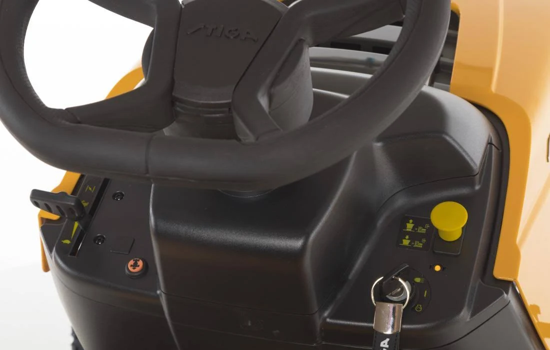 Mit dem Stiga Estate 3098 H präsentieren wir ein Modell mit einem leistungsstarken Briggs & Stratton PowerBuilt 4165 AVS Motor. Der Briggs & Stratton Motor verfügt über 8,6 kW (11,7 PS) bei 2600 U/min und einen Hubraum von 500 cm³. Das Mähwerk ist mit zwei gegenläufigen Doppelmessern ausgestattet und kann bequem über die elektromagnetische Kupplung zugeschaltet werden. Danach steht eine 98 cm Schnittbreite zur Verfügung, die sich in 7 Stufen, von 25 bis 80 mm, in ihrer Schnitthöhe regulieren lässt. Durch die Tasträder wird stets sichergestellt, dass ein Kontakt des Mähwerks mit dem Boden vermieden wird. Egal ob man das Gras im 240 Liter Fangkorb sammelt oder mit dem Mulchstopfen die hervorragende Multiclip Funktion von Stiga verwendet, das Ergebnis überzeugt immer. Der Stiga Estate 3098 H ist mit seinem komfortablen Hydrostatgetriebe für Flächen mit bis zu 4000 m² geeignet. Mit dem Hydrostatgetriebe lässt sich die Geschwindigkeit in Vorwärts- und Rückwärtsgängen stufenlos regulieren und es besteht stets die vollkommene Kontrolle über den Rasentraktor. Weitere Features des Estate 3098 H sind das Lenkrad mit Softgriff, der Komfortsitz und die LED-Frontlichter. Im Lieferumfang sind das Ladegerät, die vordere Stoßstange, eine Zugöse und ein Mulchkeil enthalten. Beachtlich sind auch seine Einsatzmöglichkeiten für den Winterdienst mit dem optional erhältlichen Schneeräumschild. Dank der LED-Scheinwerfer ist das Schneeräumen auch in den dunklen Morgen- und Abendstunden immer eine sichere Sache. Der Rasentraktor wird teilmontiert geliefert, Fangkorb, Lenkrad und der Sitz müssen montiert werden.