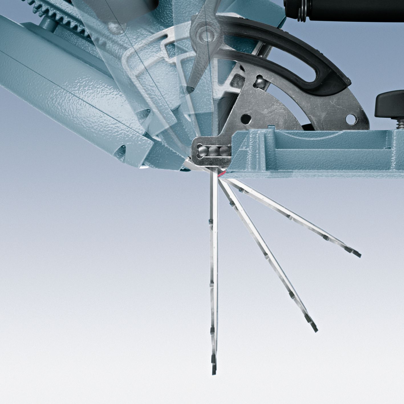 - Untere Schutzhaube mit Fernbedienung – für leichtes Freigeben des Sägeblatts z. B. beim Ansetzen im spitzen Winkel.